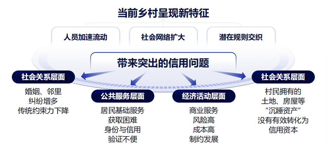 这些变化,带来了信任机制困境:一是社会关系层面,邻里纠纷更加复杂,道德约束力和宗族影响力显著下降,亟需新的、更普遍的信任纽带。二是公共服务层面,村民获取公共服务与城市存在差距,例如信贷服务,依旧困难,源于身份识别和信用风控手段不便,制约了公共服务的深入。三是经济活动层面,乡村商业活动(如农资赊销、小额信贷)依然风险高、成本高,束缚了乡村经济的活力。四是资产转化层面,村民手中宝贵的土地承包权、宅基地使用权、农房等“沉睡资产”,没有有效转化为发展亟需的信用资本。客观的说,信用差异是乡村与城市的重要差异之一,也是另一种鸿沟。