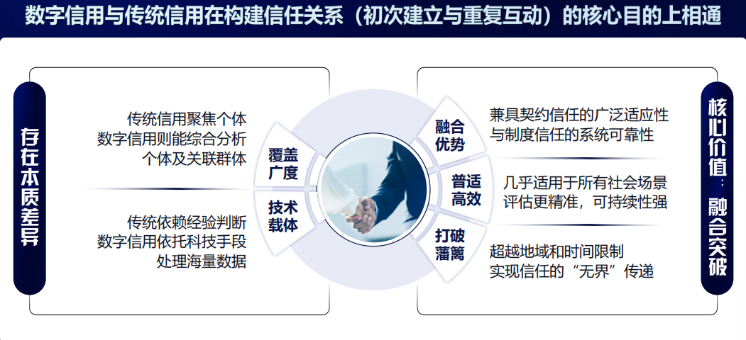 数字经济的发展一定程度上改变了传统意义上的信用关系,虽然在核心目标上,无论是建立初次信任还是维持长期互动关系,数字信用和传统信用是一致的,但数字信用带来了本质性的变革和巨大的升级空间。