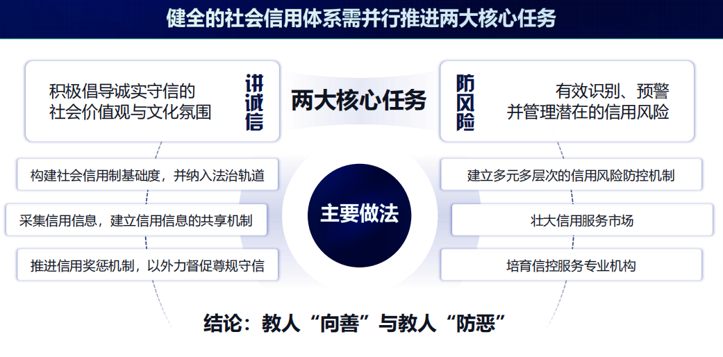 这两条腿都很重要,“教人向善”与“教人防恶”相辅相成,缺一不可,一套成熟的社会信用体系,必须同时具备引导正向行为和遏制负向行为的双重能力。但从操作角度,我们认为“防风险”更直接更快捷,“教人防恶”比“教人向善”更容易些。(要大力培育信控服务业)