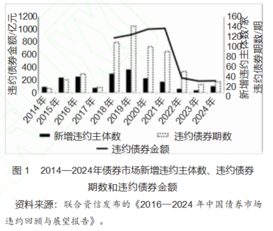 现阶段,我国信用评级行业发展进入无序竞争状态:信用评级机构不断增多,信用评级有效需求疲软,供需不匹配导致行业内竞争激烈,信用评级虚高,发债企业违约频现等不良后果。自2014年3月中国首例违约债ST超日“11超日债”宣布违约开始,我国债市零风险、零负债、刚性兑付被打破,债券市场新增违约主体、违约债券期数和违约债券金额开始大幅增加。2018—2022年属于债券违约的高发时期。截至2024年末,我国债券市场累计有297家发行人发生违约,到期违约债券962期,到期违约金额合计约7847.87亿元(见图1)。信用评级市场的无序竞争加剧,信用评级机构无法精准评估企业的信用等级,致使信用违约事件频发。
