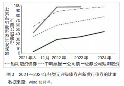同时,自2021年3月以来新发行债券中,短期融资债券、中期票据、公司债和证券公司短期融资债无评级发行期数(见图2)和占比逐年攀升。新发行短期融资中无评级债券占比从2021年的56.20%上升至2024年的96.66%;新发行证券公司短期融资则从2021年的43.10%上升至2023年的96.84%(见图3)。从发行规模看,2024年市场中无评级债券共发行8777期,占总发行期数的比例为57.18%。