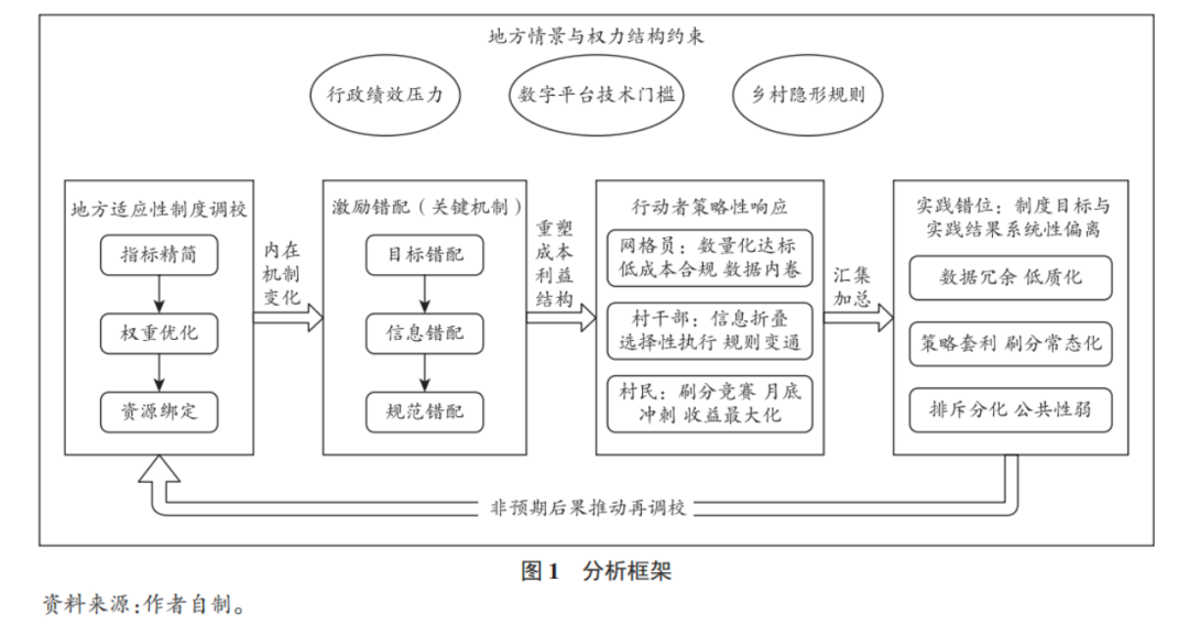首先,制度激励层是指围绕积分指标设置、权重分配与资源绑定所形成的正式规则组合,其作用在于重塑行动者的成本-收益结构与信息环境。其次,行为策略层指村民、网格员与基层干部在上述激励结构下形成的合规、应付或机会主义策略行为,例如刷分竞赛、信息折叠、绩效应付、规则变通等。最后,实践结果层是这些策略行为在基层治理过程中持续叠加后所呈现出的可观测后果,即制度运行末端与初始公共目标之间的偏离,也就是本文所界定的“实践错位”。